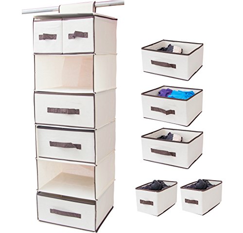 - KEEP EVERYTHING ORGANIZED: Along with the 6 shelf hanging closet system, Lovotex also gives you 5 matching drawers! Three of the drawers are large, and they fit the shelves perfectly. The other two ate smaller in size. You can use the large and small drawers for your socks, underwear and small towels, in order to keep them organized. In this way, the drawers will prevent these items from getting mixed up and you will find what you need more easily.