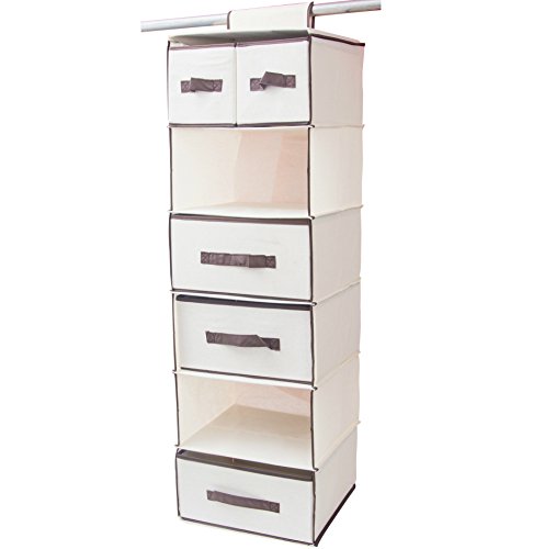 - DURABLE AND STURDY DESIGN: The hanging closet rack is made with high quality polyester canvas, which is incredibly luxurious and durable at the same time! In addition, under the thick fabric, there is medium-density fiberboard to keep the hanging dresser from bending. Once you hang the 6-shelf closet system in your wardrobe, it will remain in place and it will be able to withstand the weight of the drawers and your clothes, so store anything you want in it!