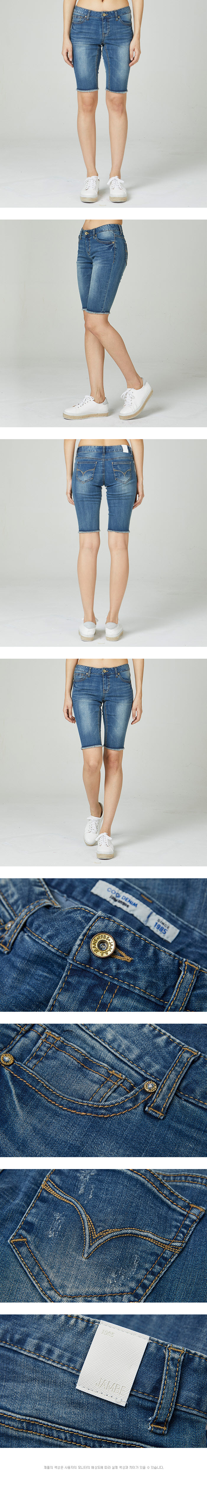 흡습성이 뛰어나 땀을 빨리 배출시켜 시원함을 느낄 수 있는 쿨맥스 소재로 밑단데끼 포인트 MB톤 바이오스톤 시와 올브러쉬 워싱의 여성용 타이트 5부 데님스타일.