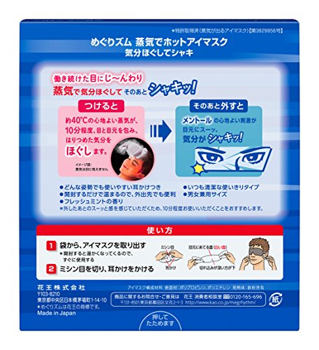 The megurhythm steaming hot eye mask instantly heats up to about 104f (40a"ƒ) and relaxes you and your eye area. The soothing warmth lasts about 10 minutes to dissolve away the day's stress. Menthol gives you a refreshing feeling after removing the mask. 14 masks. Fresh mint scent. Caution: should temperature feel uncomfortable, remove immediately. Should rash, redness, or itchiness of eye area occur, discontinue use immediately and consult a doctor. Continued use may worsen symptoms. Do not store in direct sunlight or in high temperatures. Keep out of reach of children.