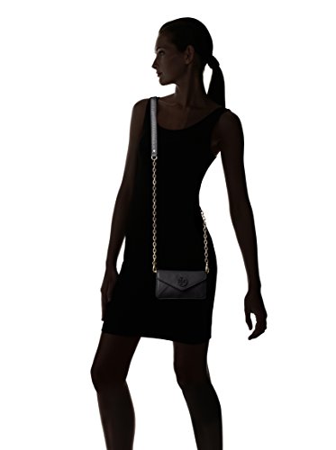 This compact and elegant Stacked T Envelope Cross-body and clutch is wrapped in Tory's very dark Navy Blue pebbled leather with golden tone hardware. The interior is lined in coordinating fabric and features 2 card slots. The flap top secures with a magnetic closure and is accented with a Tory's Stacked T logo. The removable golden chain strap features swiveling lobster claw clasps and has a drop of about 23 inches. It is quite versatile and can be worn as a shoulder bag, a cross-body, or easily remove the strap and carry it as a clutch. This small gem measures approximately 6.5 inches (L) x 3.75 inches (H) x 1.5 inch (W).Feature