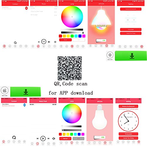 Easy for installation and use: scanning the QR code on the packing box or specification to download and install the corresponding APP of Apple or Android system. Rotating the bulb into the standard pedestal E27 and opening the power supply and the bulb switch. Connecting the telephone Bluetooth and then you can control the colors, light intensity and music of the bulb by the APP.