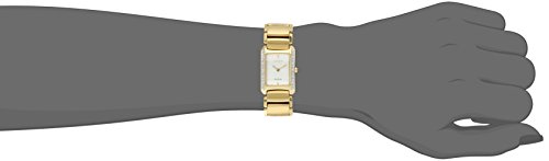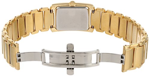 -. Feature : Gold-tone watch in stainless steel featuring white rectangular dial with faceted hour markers at 12 and 6 o'clock, diamond-set bezel, and link bracelet / Japanese quartz movement with analog display / Eco-Drive is fueled by light so it never needs a battery / Features protective anti-reflective sapphire crystal dial window and deployant clasp with push-button closure / Water-resistant to 50 m (165 ft)