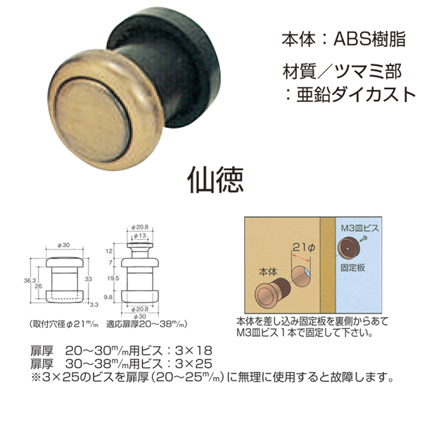 ●スペック:本体外径φ30mm 取付穴径φ21mm 適応扉厚20~38mm