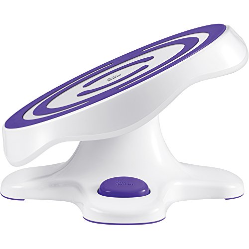 This tilting turntable features a non-slip soft grip design molded into the top plate to securely keep your cake in place as it tilts and turns for easier decorating. The large push button controls the tilting mechanism that provides 18 different yet secure plate positions, making it easy for left- and right-handed decorators to precisely decorate every surface on a cake. Decorating anything is easier when you can change the angle of the surface to be decorated, from garlands on the sides of a cake to lettering a candy plaque, even decorating cookies. The top plate rotates smoothly in either direction and can be locked in place when desired for detail work. The combination of the tilting mechanism and the 5 in. high base takes the strain off your back as you decorate by bringing the cake closer to eye level. The weight-balanced base and non-slip feet secure the turntable on the work surface so you don't have to worry about your plastic turntable tipping. Can accommodate cake boards larger than 12-inch diameter; great for 3-D shaped cakes as well as more standard square and round cakes. The 12-inch diameter x 7-inch high turntable comes apart for easy cleaning.Feature