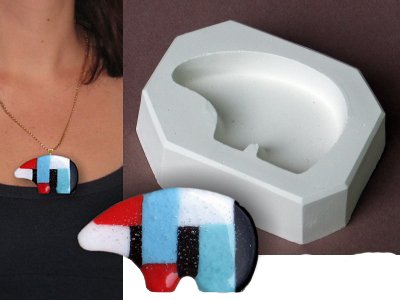 Create your own unique design using our jewelry casting molds. Mold measures approx. 3.5" x 2.5" x 1-1/8" (mold itself), 2.5" x 1.75" (bear pendant) and comes with a 2oz sample of our Coarse Frozen Frit Blend, 96COE for you to try!