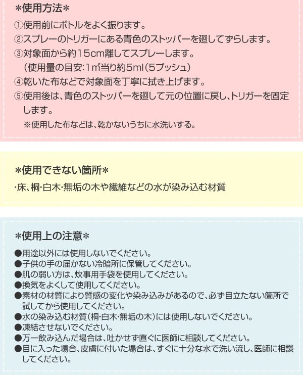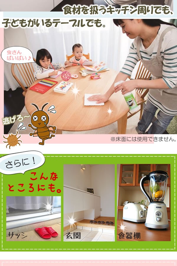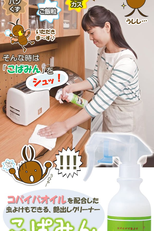 | 炊飯器、電子レンジ、トースターの周りはご飯粒や食品カス、パンくずでいっぱい。放置しておくと虫の餌に。そんな方には「こぱみん 艶出しクリーナー」!いつものキッチン周りのお掃除で艶出しと虫よけができます。虫よけ成分は安心のコパイバオイルを使用。他にもサッシや玄関などの虫の侵入場所に。 |