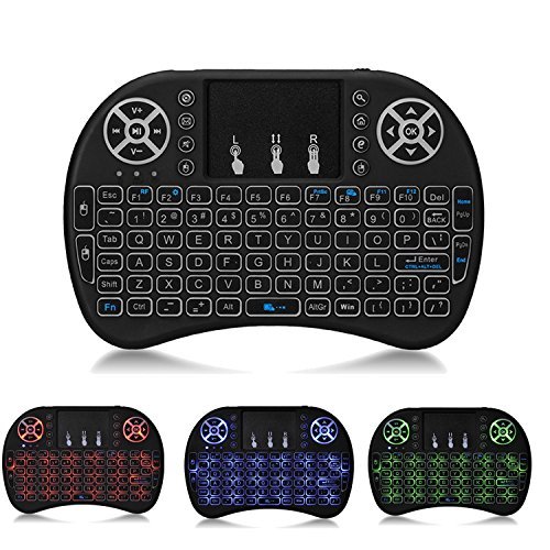 -. Feature : Innovative shape, protable, elegant, Perfect for PC, Pad, Andriod TV Box, Google TV Box, Xbox360, PS3, HTPC/IPTV / Perfect size wireless keyboard remote: Perfect size keyboard natural feeling while typing, keys have a soft touch, size of your hand with a lot of functions. In the back of the keyboard, the small bumps make it easier to grip and hold by one hand and two hands. / Backlight wireless keyboard: mini touchpad keypad remote is with backlights of 3 colors. The backlights are evenly distributed on the wireless keyboard and very easy to see at night or in a theater room / Plug and play: Short-cut Key: There are 8 multimedia function keys such as on/off switch, mail box, mute, mouse left, searching, open my computer, browser home page and mouse right, which can save your time and improve your working efficiency. / Touchpad keypad remote: Touch pad on the remote it makes it super easy to use, built-in high sensitive smart touchpad with 360-degree flip design, you could enjoy a better time when play games