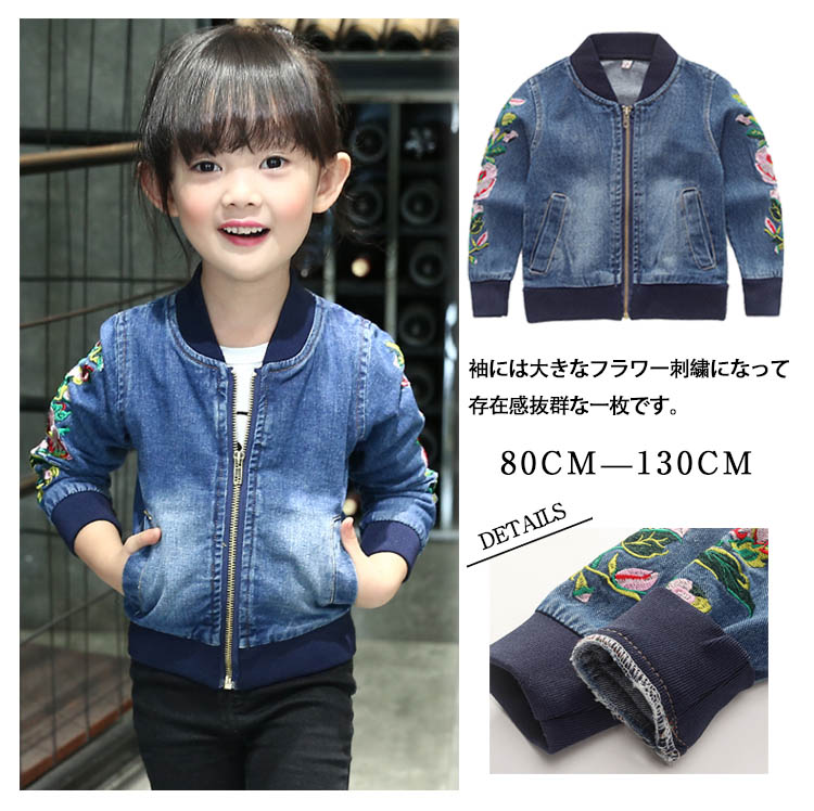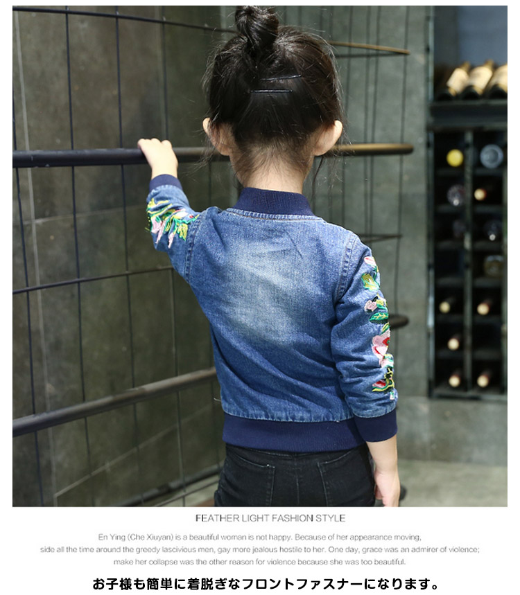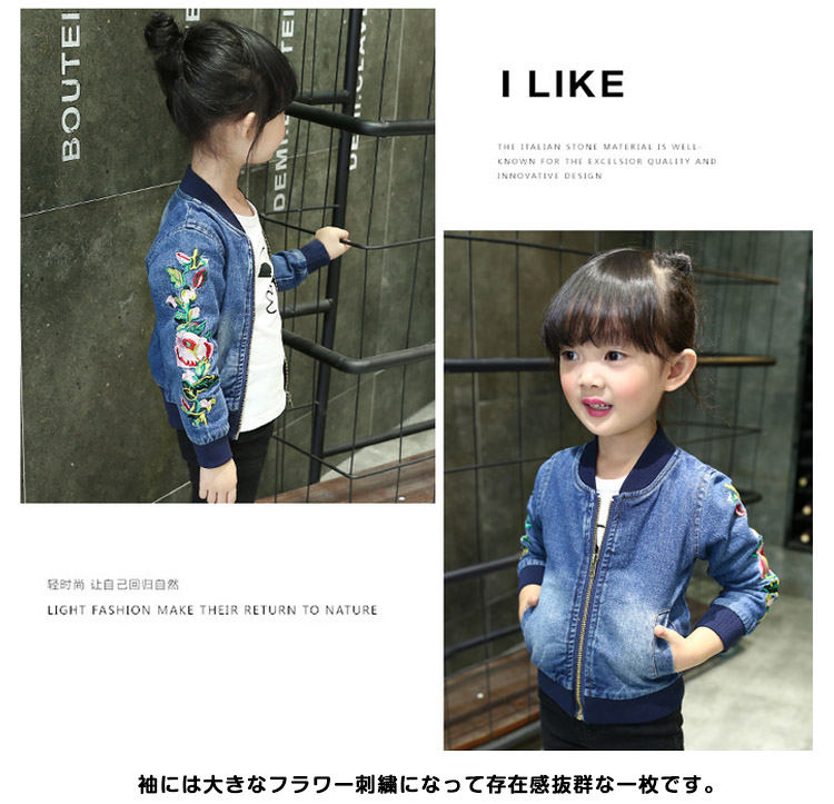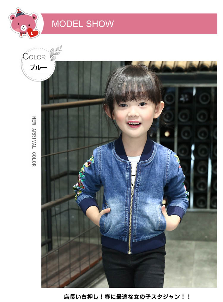 | 店長いち押し!春に最適な女の子スタジャン!!袖には大きなフラワー刺繍になって存在感抜群な一枚です。柔らかく通気性に優れたデニム素材を使用します。お子様も簡単に着脱ぎなフロントファスナーになります。寒気の侵入を妨げるために、リブ切り替えデザインもワンポイントです。ジャストサイズ感で今季一枚持っているととっても便利ですよ♪ | |