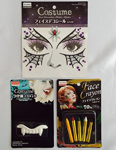-. Feature : Halloween Face Decoration Set. / Spider Face Sticker / Face Crayon Set of 5 : Yellow, Red, Green, White, Black / Dracula Fake Fangs