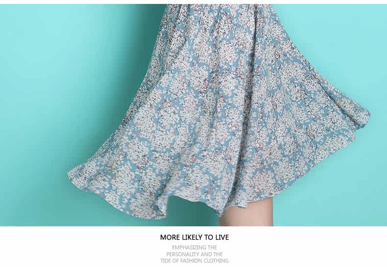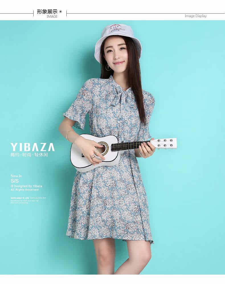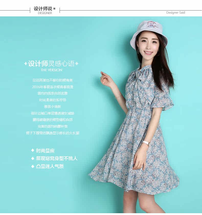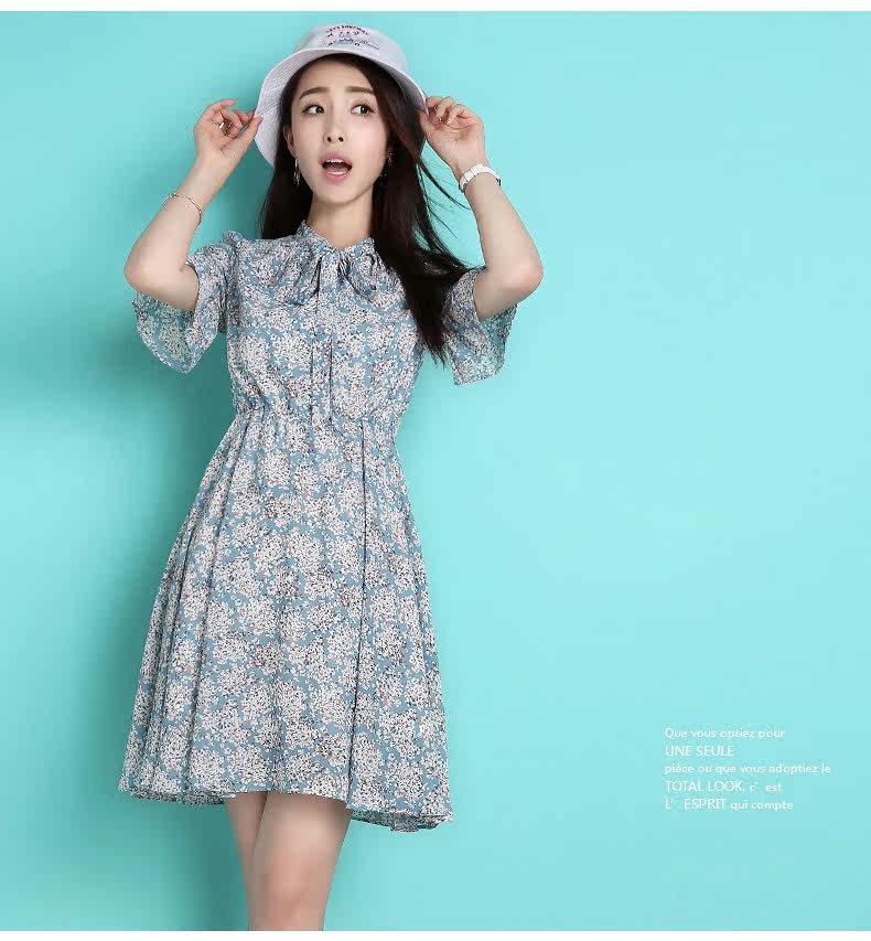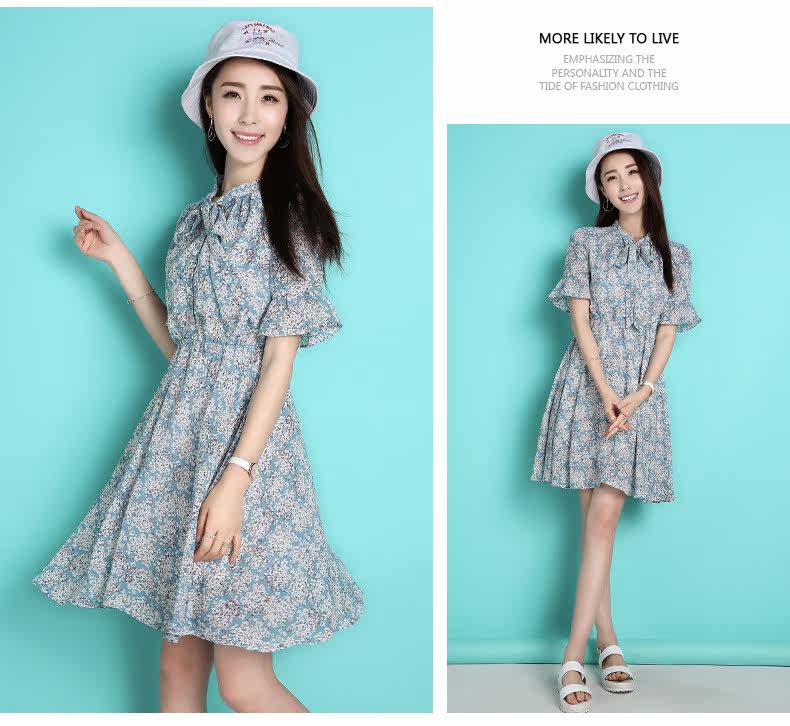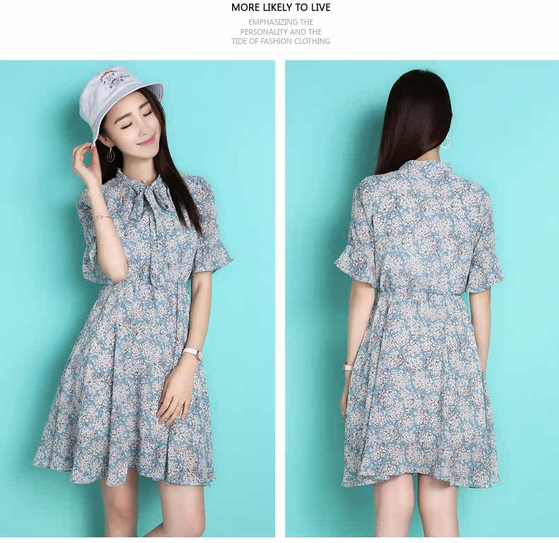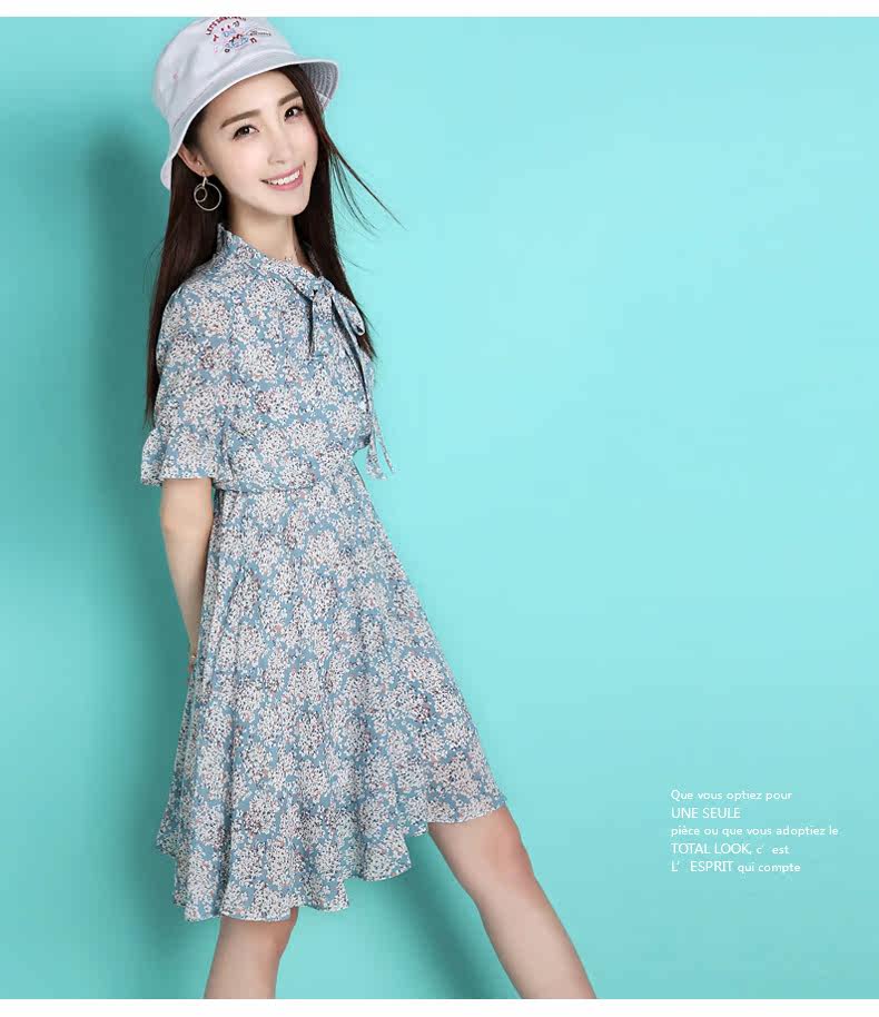 蝴蝶结雪纺连衣裙夏韩版新款荷叶袖短裙修身田园清新碎花裙