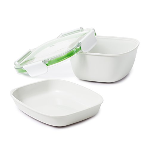 Say "so long" to soggy sandwiches. The OXO Good Grips On-the-Go Lunch Container ensures your dry ingredients stay dry until you're ready to construct the perfect sandwich. With two leakproof compartments to keep wet and dry ingredients separate, tomatoes and pickles keep to themselves and bread stays fresh. The crystal-clear, durable lid is made of BPA free Tritan and features four locking tabs and silicone gasket create a secure seal. The On-the-Go Lunch Container can also be used without the plate for one large leakproof compartment and all parts are dishwasher safe.Feature