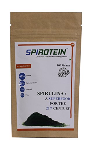 -. Feature : Natures Own Healthiest Green Superfood in Mango Flavour. / Spirulina is one of the most nutrient dense foods on the planet containing over 100 nutrients. It has been found to have more antioxidant activity than 5 servings of fruits & vegetables, 2300% More Iron than Spinach, 3900% More Beta-Carotene than Carrots, 375% more Protein than Tofu and 31 times more Phytonutrients than blueberries. / Supports Total Body Health & Cellular Health. / Contains upto 15% Phycocyanin - a Powerful antioxidant. / Contains 8 essential amino acids that the body cannot synthesise: isoleucine (essential for growth), leucine (stimulates brain functions), lysine (required for antibody, enzyme and hormone production), methionine (rich in sulphur and anti-oxidant properties), phenylalanine (essential for the thyroid), threonine (improves intestinal and digestive function), tryptophane (serotonin regulator) and valine (natural mental and physical capacity stimulant).