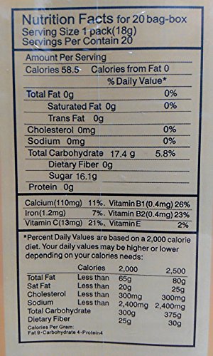 -. Feature : Honey Ginger tea with LEMON / 20 bags (18g/0.63oz) / 100% Natural, Caffeine Free / 58.5 calories 0 Fat / Serve with Hot or Cold water