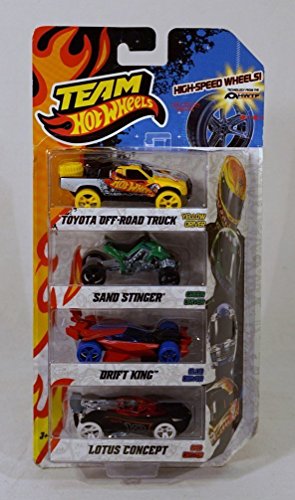-. Binding : Toy -. Brand : Hot Wheels -. Feature : Team Hot Wheels High-Speed Wheels! / Toyota Off-Road Truck - Yellow Driver / Sand Stinger - Green Driver / Drift King - Blue Driver / Lotus Concept - Red Driver -. IsAdultProduct : 0 -. Label : Hot Wheels -. Manufacturer : Hot Wheels -. PackageQuantity : 1 -. ProductGroup : Toy -. ProductTypeName : TOYS_AND_GAMES -. Publisher : Hot Wheels -. Studio : Hot Wheels -. Title : Team Hot Wheels Vehicle 4-Pack