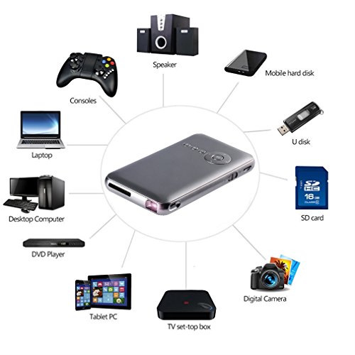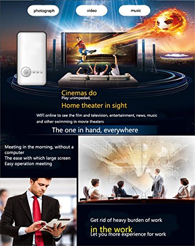 2.High Quality,Multimedia Display: This uniquely slim, wireless, smart projector features a POWERFUL, lithium polymer built-in 5000mAh battery lasts for up to 3 hours, an HD 1080P presentation screen for remarkable brightness, as well as built-in dual Wi-Fi and bluetooth. It also has a SD CARD input and can support USB or other memory hard drives.With android 4.4 and 14.2version, you can view all your streaming Apps.