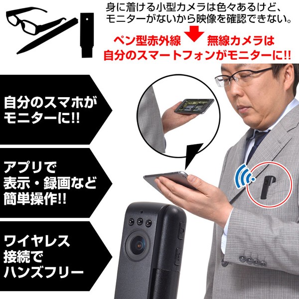 離れてもスマホでCHECK!ワイヤレスで映像をリアルタイムで表示・録画!ペン型赤外線無線カメラ!Wi-Fi接続自分のスマホで自由自在!カメラの映像を離れた場所でもスマートフォンでチェックできる! ワイヤレスで映像をリアルタイム表示・録画できる小型のスティックタイプカメラです。 専用のアプリを使用する事で、Wi-Fi接続でご自分のスマートフォンでカメラの映像をチェックできます。 赤外線LED内蔵なので夜間の撮影もOK。 付属のHDMIケーブルを使用して、大型ディスプレイに表示させることもできます。 コーデックはH.264。高画質ワイドダイナミックレンジ機能搭載。 重さはわずか50gと超軽量で小型。ポケットに入れておけば邪魔になりません。 高性能で非常に使いやすい小型カメラなので、防犯や子供の見守りなどでお役に立ちます。
