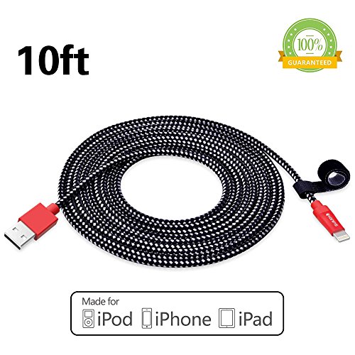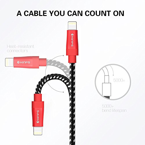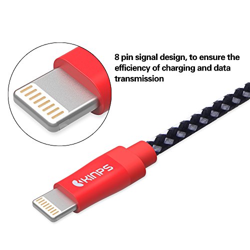 Kinps Apple MFi Certified Lightning to USB Cable 10ft/3m iPhone Charger Cord Super Long for iPhone 7 / 7 Plus / 6S / 6S Plus / 6 / 6 Plus / SE / 5S / 5, iPad Pro / Air / Mini (Nylon Black and Red)