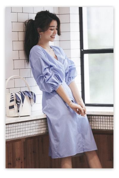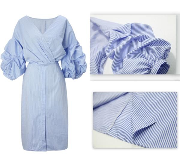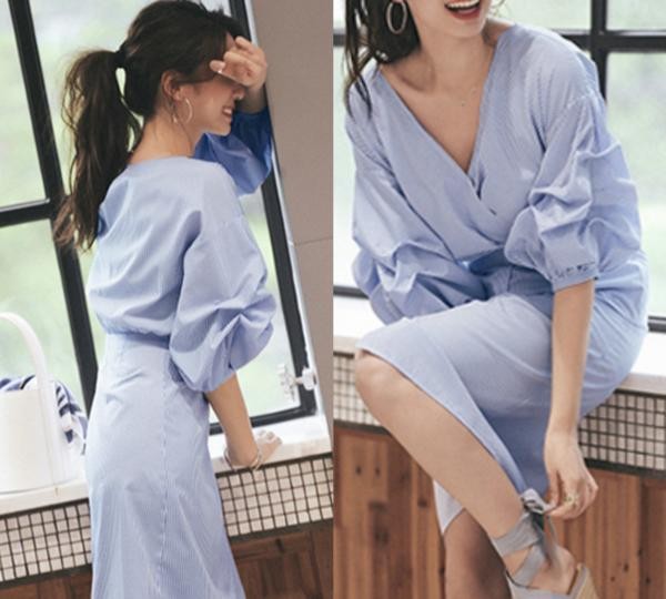 上品 ストライプ柄 ボリューム袖 Vネック 膝丈シャツワンピース