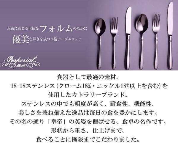 食器として最適な素材、18-18ステンレス(クローム18%・ニッケル18%以上を含む)を使用したカトラリーブランド。形状から重さ、仕上げまで食べることに極限までこだわり、カトラリーの中でもユーザビリティを実現しました。耐食性、機能性、美しさを兼ね備えた逸品は毎日の食を豊かにします。その名の通り「皇帝」の英姿を偲ばせる、食卓の名作です。贈り物にも最適なボックスケースでのお届け。 |