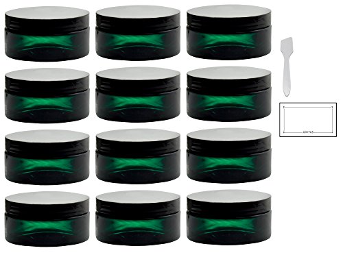 8 oz Green PET Plastic (BPA Free) Refillable Low Profile Jar (12 Pack) + Spatulas and Labels
