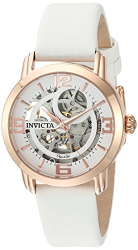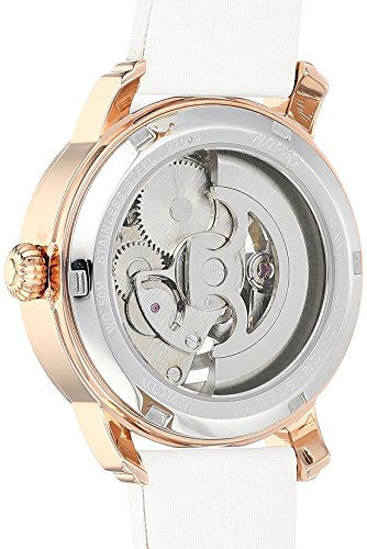 White and silver see-thru skeletonized dial with rose gold tone hands, hour markers and arabic numerals; luminous; 18k rose gold ion-plated stainless steel case; white satin strap with leather lining