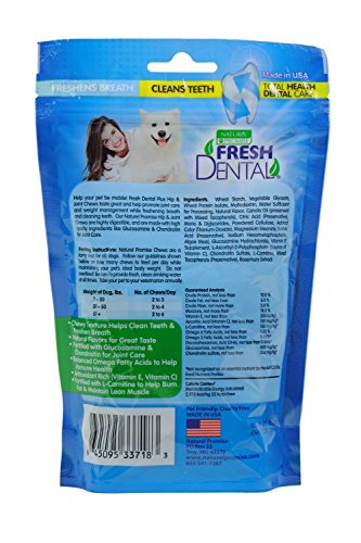 -. Binding : Misc. -. Brand : Naturel Promise -. EAN : 0645095337183 -. Feature : Promotes Healthy Hip & Joints / Do not over feed your pets. Make sure there is plenty of drinking water available before and after treats are given / Treats are easily digestible and can be broken down before giving them to your pets / A great tool to use for recognition and training with your pet / Made in the USA! -. Label : Naturel Promise -. Manufacturer : Naturel Promise -. MPN : 337183 -. PackageQuantity : 1 -. PartNumber : 337183 -. ProductGroup : Pet Products -. ProductTypeName : PET_SUPPLIES -. Publisher : Naturel Promise -. Studio : Naturel Promise -. Title : Naturel Promise Fresh Dental Hip & Joint Chews, 8-Ounce -. UPC : 645095337183