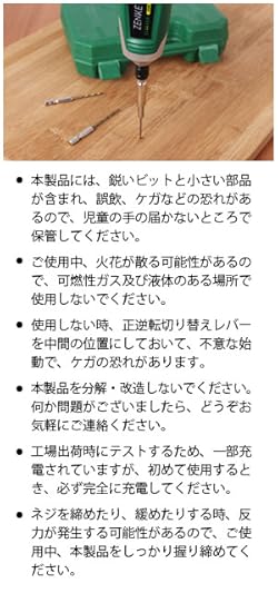3, 本製品のトルクは4.5N・Mで、木、プラスチック、薄い金属片などにご使用可能ですが、壁、タイル、ガラスなどに使用しないでください。