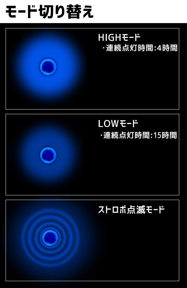| 仕様 | 電池:単4×1本(付属) 明るさ:3種(HIGHモード・LOWモード・ストロボ点滅モード) 点灯時間:4時間(HIGHモード)、15時間(LOWモード) 防水:60m 取扱説明書有(外箱記載) |