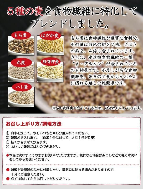 話題のもち麦を中心に、はだか麦、丸麦、胚芽押麦、ハト麦の5種類の国内産の麦をブレンドした、食物繊維たっぷりの雑穀米です。摂取することで、不足しがちな水溶性食物繊維を毎日の主食から簡単に摂れる嬉しい雑穀米です。 |