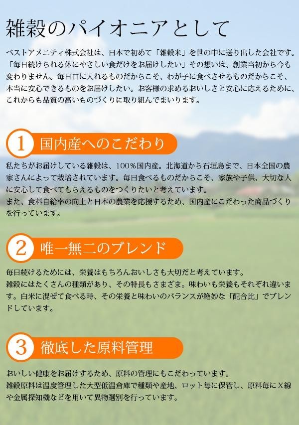 | 話題のもち麦を中心に、はだか麦、丸麦、胚芽押麦、ハト麦の5種類の国内産の麦をブレンドした、食物繊維たっぷりの雑穀米です。摂取することで、不足しがちな水溶性食物繊維を毎日の主食から簡単に摂れる嬉しい雑穀米です。 |