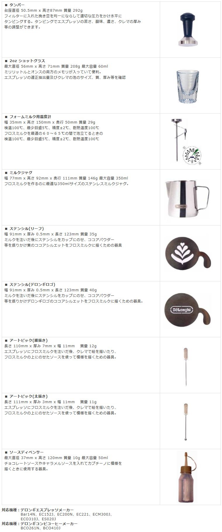 ● Coffee life expands infinitely with this varistor kit ● Set contents: tamper, 2 oz shot glass, thermometer for foam milk, milk jug, stencil (leaf), stencil (deLonghi logo), aa topic (fine drawing),