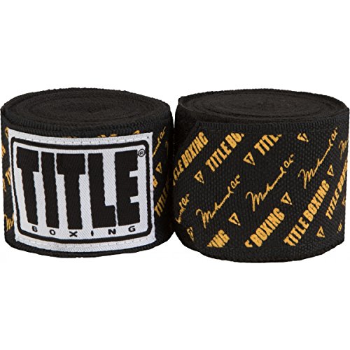 -. Binding : Misc. -. Brand : Title Boxing -. Feature : Incredible double-cut thickness semi-stretch wraps / Manufactured with the perfect blend of polyester and Spandex blend / Reinforced starter thumb loop and hook-and-loop closure / Extra-long 180" length / Sold in pairs -. Label : TITLE Boxing -. Manufacturer : TITLE Boxing -. MPN : 116109 -. PartNumber : 116109 -. ProductGroup : Sports -. ProductTypeName : SPORTING_GOODS -. Publisher : TITLE Boxing -. Studio : TITLE Boxing -. Title : Muhammad Ali Authentic Stretch Hand Wraps, Black/Gold