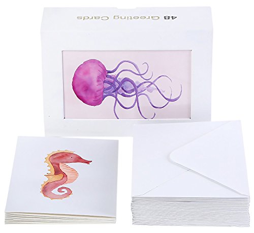 48 Pack All Occasion Assorted Blank Note Cards Greeting Card Bulk Box Set, Blank on the Inside, 6 Watercolor Sea Designs Jellyfish, Starfish and Seahorse - Envelopes Included, 4 x 6 Inches