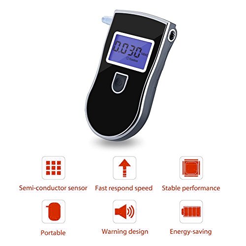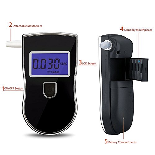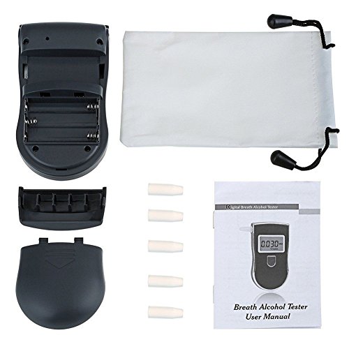 Studio : WEGGI Publisher : WEGGI Binding : Health and Beauty Product Description This is a professional police digital breath alcohol tester. High quality and high accuracy and sensation, can respond in 5 seconds. With the port to insert mouthpiece. Health and convenience. Specification: Color: Black LCD blacklight: Blue Sensor: Advanced flat surfaced alcohol sensor Warm-up time: Within 10 seconds Respond time: Within 5 seconds Operating temperature range: 5~40 Detection range: 0.000-0.199% BAC / 0.00-1.99 BAC / 0.00-0.99 mg/L Digital display results (% BAC / BAC / mg/L) Power input: 3V (3 x "AAA" alkaline battery, not included) Net weight: 80g Dimension: 112*60*30mm Package weight: 195g Package size: 165*120*47mm Package including: 1 x Breath Alcohol Tester 5 x Mouthpieces 1 x User Manual Pay attention: When after drinking, It is recommended to last after 20 minutes. It is because 20 minutes is approximately for alcohol to be absorbed into blood from the digestive organs, and residual alcohol remaining in the mouth takes this long to dissipate. Alcohol tester is a precision instrument, it is best for you use with reference to the instruction (included)