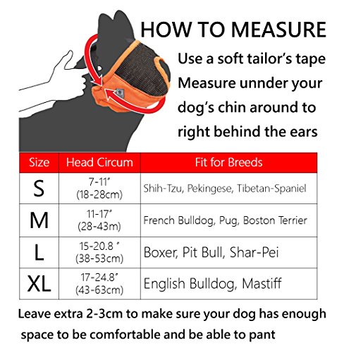 Size Instructions S--Head Circumference: 7-11"(18-28cm); To fit e.g Shih-Tzu, Pekingese, Tibetan-Spaniel M--Head Circumference: 11-17"(28-43m); To fit e.g French Bulldog, Pug, Boston Terrier L--Head Circumference: 15-20.8 "(38-53cm); To fit e.g Boxer, Pit Bull, Shar-Pei XL--Head Circumference: 17-24.8"(43-63cm); To fit e.g English Bulldog, Mastiff