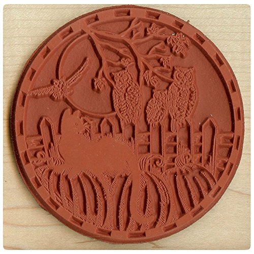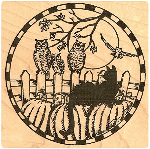 -. Title : {Single Count} Unique & Custom (4" Inches) "Halloween, Pumpkin, Cat & Owls Scene" Round Circle Shaped Genuine Wood Mounted Rubber Inking Stamp