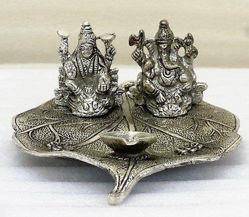 Lightahead ® Lord Ganesh & Goddess Lakshmi a unique diya tea light candle stand in white metal statue of Hindu Gods on a leaf made in India Great Diwali gift