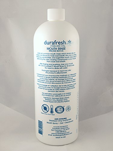 -. Binding : Health and Beauty -. Brand : Durafresh Oral Rinse -. EAN : 0738450009921 -. Feature : Non-toxic unlike widely available commercial products / Does not contain alcohol and is sugar free / Eliminates bad breath or halitosis by penetrating deeply into the gum line / 32 oz of long lasting and pleasant taste / 2 tsp. is all you need after brushing or flossing (1 capful) -. IsAdultProduct : 0 -. Label : Zinnelle Labs Inc. -. Manufacturer : Zinnelle Labs Inc. -. NumberOfItems : 1 -. PackageQuantity : 1 -. ProductGroup : Health and Beauty -. ProductTypeName : HEALTH_PERSONAL_CARE -. Publisher : Zinnelle Labs Inc. -. Studio : Zinnelle Labs Inc. -. Title : Durafresh Oral Rinse 32 oz - The Ultimate in Fresh Breath, Healthy Gums and Better Dental Check-ups! -. UPC : 738450009921