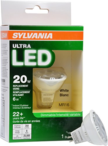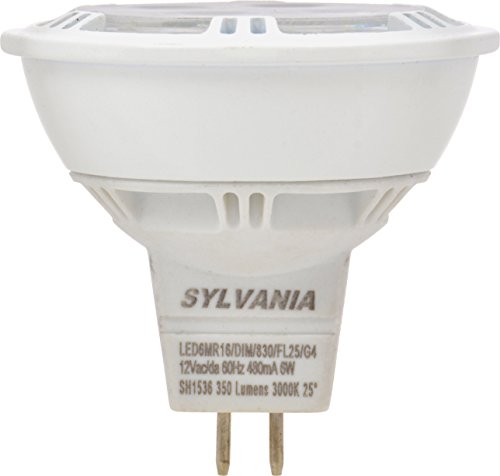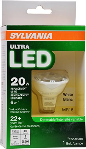 Sylvania 74050 ultra 6W dimmable LED light replacing 20W halogen Mr16 12V bi-pin base with 3000K color temperature