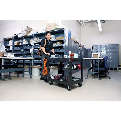 Rubbermaid Commercial 1867535 Executive Series Heavy-Duty 2-Shelf Utility Cart with Quiet Casters. Best-in-class casters to meet the most demanding environments. Ergonomically designed push handle provides optimum hand placement and push height improving control and worker safety . High-density structural resin construction with molded-in customizable fittings, storage compartments, holsters, hooks, and notches. Quiet casters and wheels allow workers to move quickly and quietly throughout a property. 44.5 inches long by 25.25 inches wide by 8 inches high. 41 pounds. Made in the USA.