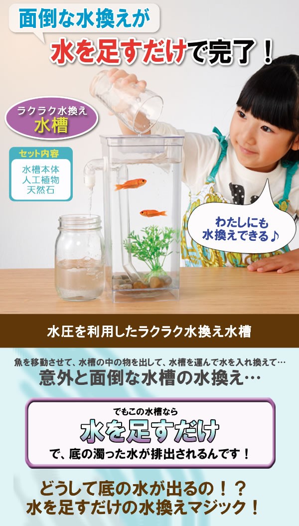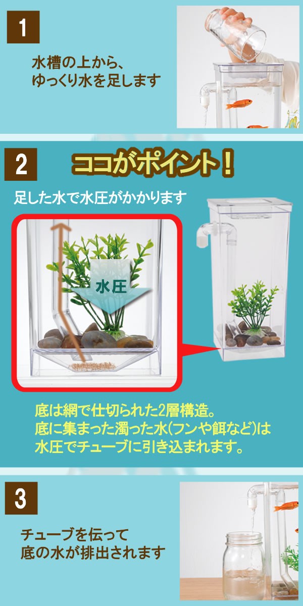 | 魚を移動させて、中の物を取り出して、水槽を運んで水を入れ換えて…意外と面倒な水換えが、この水槽なら水を足すだけでOK!足した水で水圧がかかり、底にたまった水がチューブを伝って自然に排出されます。魚を移動する必要もありませんので、魚にも優しい水槽です。 |