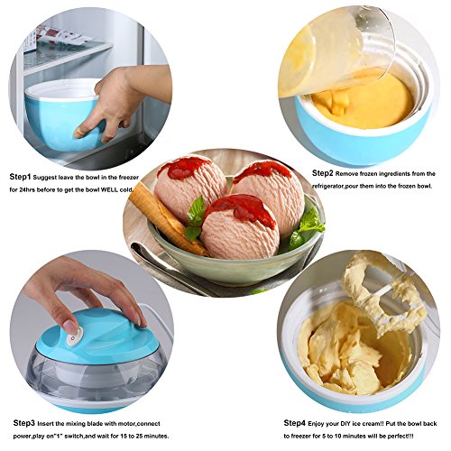 How to use? *1.For effective usage. kindly store the bowl in the freezer at a maximum temperature of 0 Fahrenheit (-18 Degree Celsius). *2.Kindly use 6 - 12 Ounce of mixture and make sure that the ingredients are stored in refrigerator before use. *3.In case if the parts do not fit well, kindly press down the lid lightly for few minutes to ensure that the lid assembly is seated. *4.Fresh & creamy ice cream in minutes. Make it and serve it right in the same bowl. *5.Use your own healthy ingredients. Make ice cream in 6 - 12 minutes.