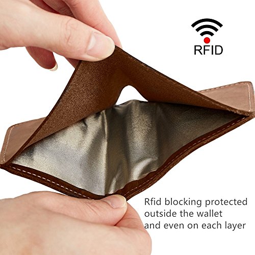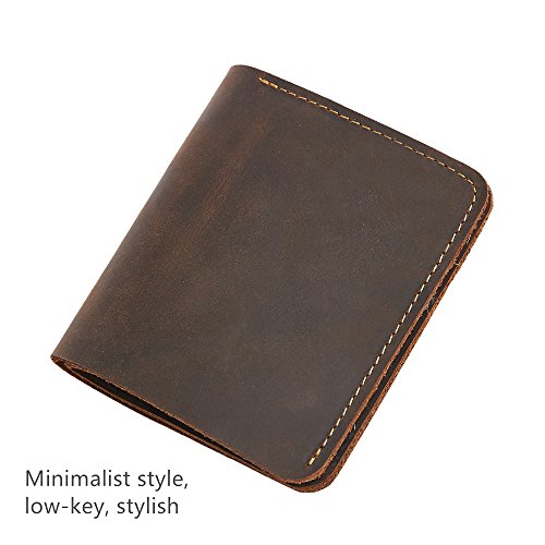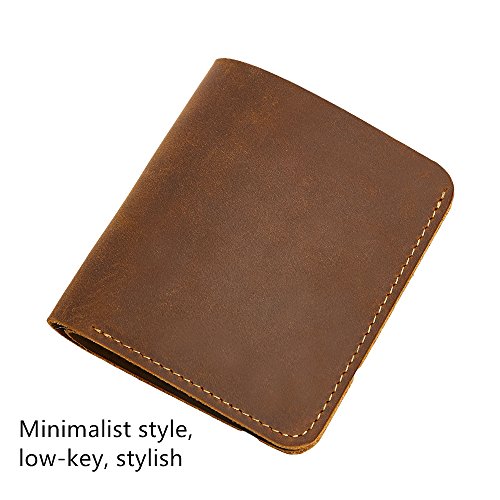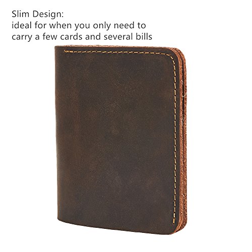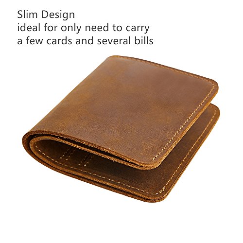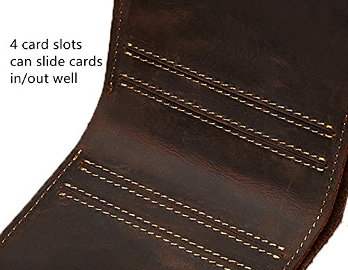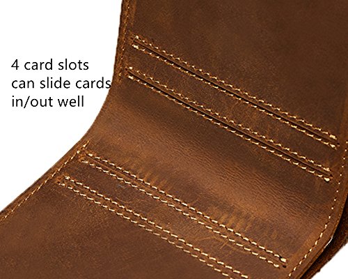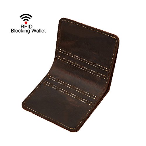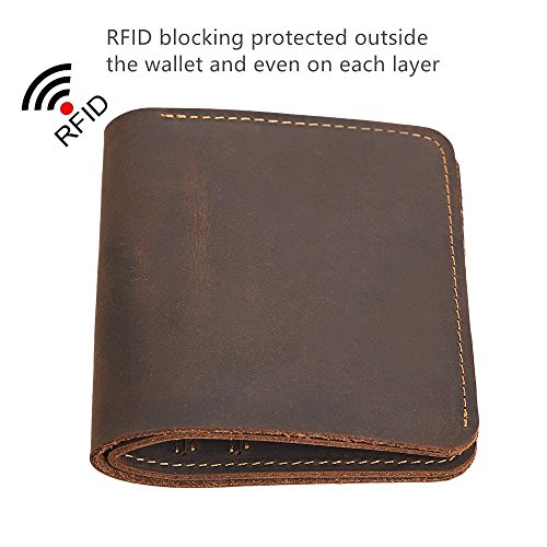 -. Feature : RFID wallet for men RFID BLOCKING protected outside the wallet and even On each layer. With the new identity theft, a RFID protective wallet is very necessary! we leverage mens credit card wallet top RFID technology to block RFID signals used to electronically scan your wallet as someone passes by unnoticed. This RFID wallet keeps your vital information in driver license, debit cards and credit cards from being stolen, our RFID blocking wallet is very good for travel protection. / SLIM WALLET DESIGN: you simply MUST have it! Our security wallet Only sizing 3.5" X 3.9" X 0.59" SLIM Profile DESIGN RFID blocking wallet allows for front pocket or rear pocket storage. Even with its slim design, It features with quick access 4 card slots with thumb holes for you to place your most frequently used cards, 1 compartment to hold dditional cards, receipts or unfolding cashes. ideal for when you only need to carry a few cards and several bills. / This is a RFID protection wallet SUPERIOR QUALITY well design, good crafted and durable credit card protector wallet, card slots can slide cards in/out well, individually hand-made with strong inner lining stitching that trained experts personally inspect to ensure a durable, high quality build. / 100% GENUINE LEATHER: Top grade soft and luxurious genuine crazy horse leather, soft and incredibly durable. Our credit card protector wallet great for long use, as your wallet ages, it will develop a deep, rich patina adding to the appeal and character of the leather. / MINIMALIST STYLE, Simple life. A minimalist RFID protection wallet Simple low-key appearance and gorgeous colors, elegant, stylish, protector card case wallet perfect for business traveling, weekend getaways, school, and other outdoor activities in daily life. Our mens wallet is in Gift Box Packing, which is also one of the most special gifts for Groomsmen, Birthdays, Anniversaries, Father's Day, Christmas and other Special Occasions.