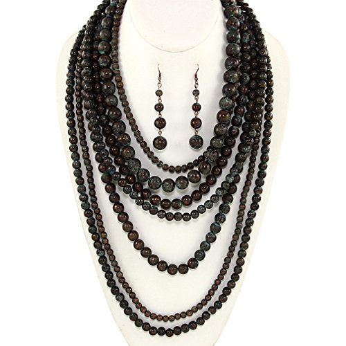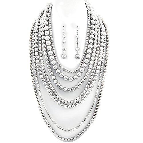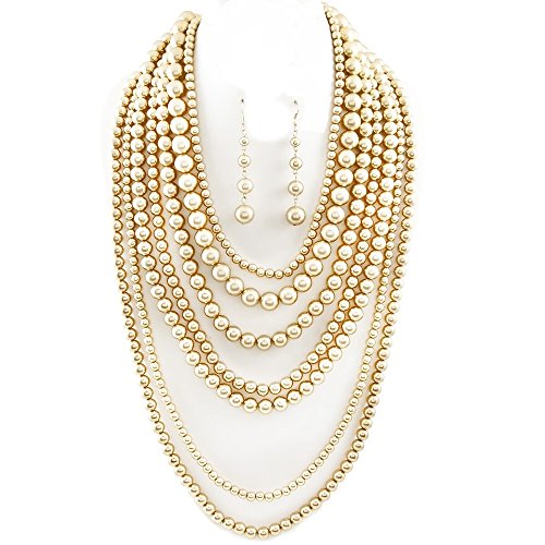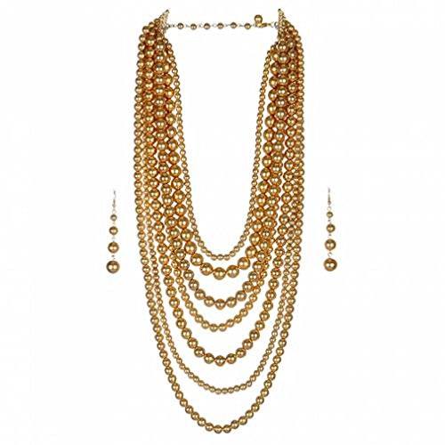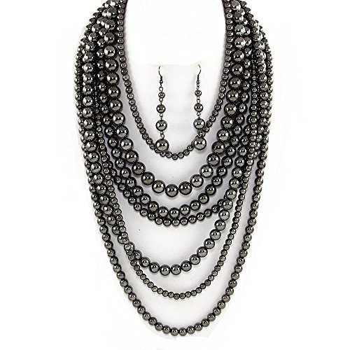 Gorgeous statement layered beaded Simulated-pearl acrylic metallic coated pearl beads strands necklace matching hook earrings set. Elegant costume Jewelry.