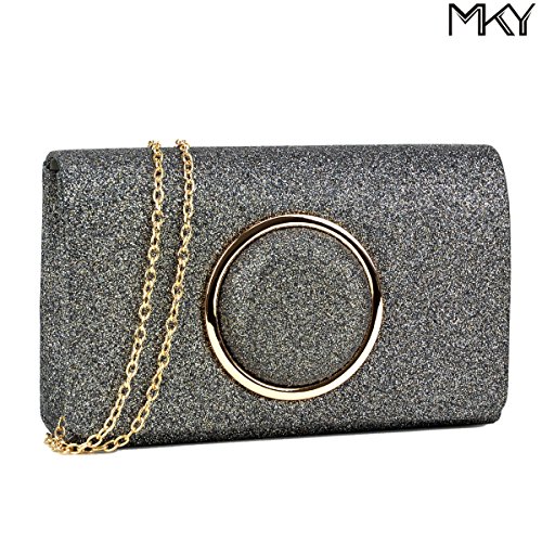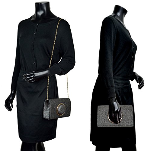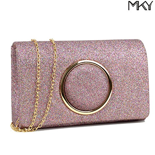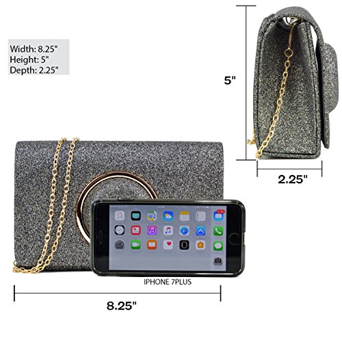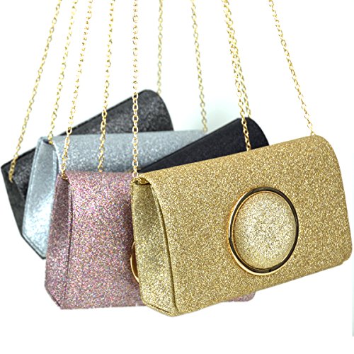 Product Description This evening palm-perfect clutch is frosted with glistening flakes that will make you glow during your special occasion. Uniquely designed with a Gold round circle, match this fashionable clutch with your evening gown and it will brings out the special glamour look in you. Inside can easily fit a cell phone, wallet, compact mirror, lip gloss, and a pack of gum. Conveniently, you can spend the night hands free with the detachable silver chain that is included.