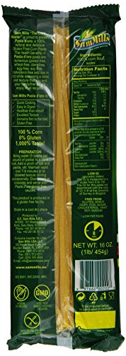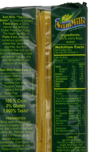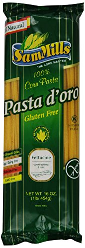 -. Binding : Grocery -. Brand : Sam Mills -. EAN : 0897660002228 -. Feature : Pack of twelve, 16-ounce bags (total of 192 ounces) / Made from 100% GMO Free Corn / Gluten Free; Cholesterol Free; Kosher; Soy Free; Low Fat / Quick Cooking; Not Instant but cooks in half the time / Cleanest label in the industry, measuring UNDER 5 PARTS PER MILLION FOR TRACES OF GLUTEN -. Label : Sam Mills -. Manufacturer : Sam Mills -. MPN : SPK-01624485 -. NumberOfItems : 12 -. PackageQuantity : 12 -. PartNumber : SPK-01624485 -. ProductGroup : Grocery -. ProductTypeName : GROCERY -. PublicationDate : 2011-03-25 -. Publisher : Sam Mills -. Studio : Sam Mills -. Title : Sam Mills Pasta D'Oro Gluten Free Fettuccine, 1-Pound (Pack of 12) -. UPC : 897660002228