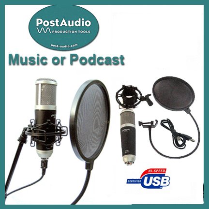 -. Brand : Post Audio -. Color : Black with Silver -. EAN : 0741360244955 -. Feature : Professional U1600 Large Diaphragm USB studio condenser mic / Neumann style microphone shock mount / PF-16 double sided pop filter on 16" gooseneck / Audio quality, extra long USB cable -. Label : Post Audio -. Manufacturer : Post Audio -. Model : U1600PK -. MPN : U1600 -. PackageQuantity : 1 -. PartNumber : U1600 -. ProductGroup : Musical Instruments -. ProductTypeName : SOUND_AND_RECORDING_EQUIPMENT -. Publisher : Post Audio -. Studio : Post Audio -. Title : Post Audio Professional Recording or Podcast Setup USB Condenser Mic with Shock Mount and Cable Plus Free Pop Filter -. UPC : 741360244955