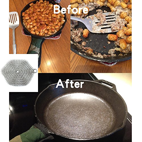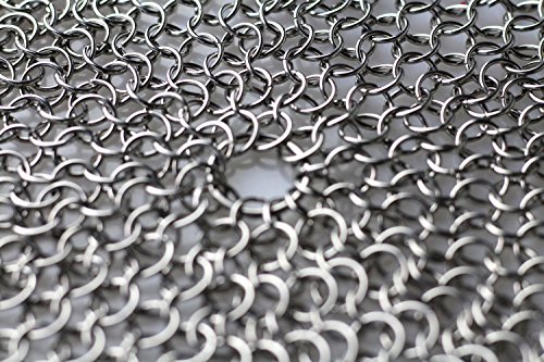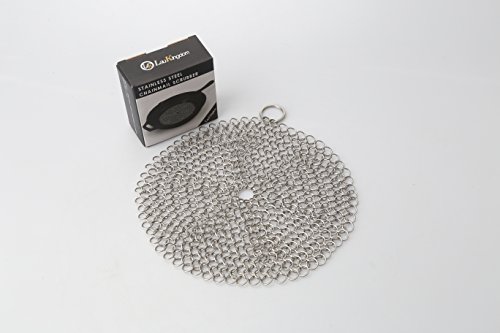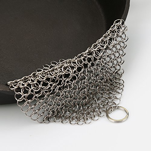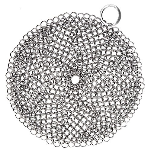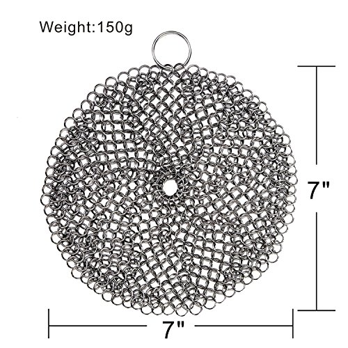 LauKingdom Cast Iron Cleaner XL 7x7 Inch Round Stainless Steel 316 Chainmail Scrubber for Cast Iron Cookware. WORKS LIKE A CHARM ON STAINLESS STEEL COOKWARE ENAMELED CAST IRON, AND MORE.. The 7x7 inch Small Ring Round Chainmail Scrubber makes fast work of tough cleanup