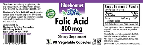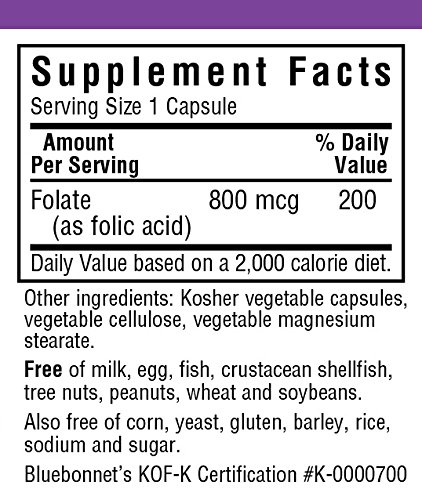 Bluebonnet's Folic Acid vegetable capsules provide pure crystalline folic acid in easy-to-swallow vegetable capsules for maximum assimilation and absorption. Folic acid is used for preventing and treating low blood levels of folic acid, as well as its complications, anemia, the inability for the bowel to absorb nutrients properly. It can also be used for ulcerative colitis, liver disease, alcoholism, and kidney dialysis. For women who are pregnant or might become pregnant take folic acid to prevent miscarriage and "neutral tube defects, "birth defects such as spina bifida. Folic acid is involved in producing DNA.Feature